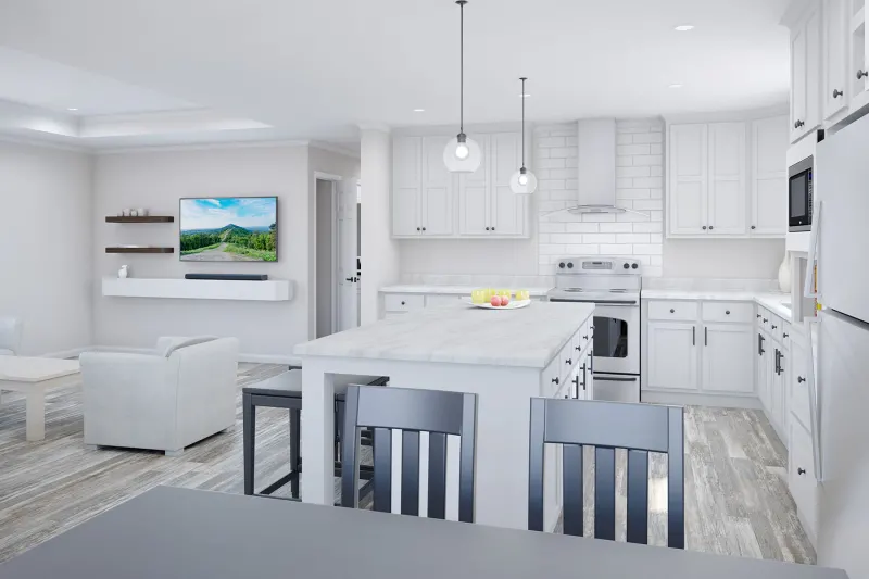 a thoughtfully designed 3-bedroom, 2-bath doublewide offering 1,422 sq. ft. of comfortable living space. With a spacious open-concept living room, kitchen, and dining area, this home is perfect for everyday living and entertaining. The kitchen features ample cabinet space, a pantry, and room for full-size appliances. The private primary suite includes a generous bedroom and a well-appointed bath, while two additional bedrooms are conveniently located on the opposite side of the home—ideal for family, guests, or a home office. A covered porch option adds extra curb appeal and outdoor enjoyment